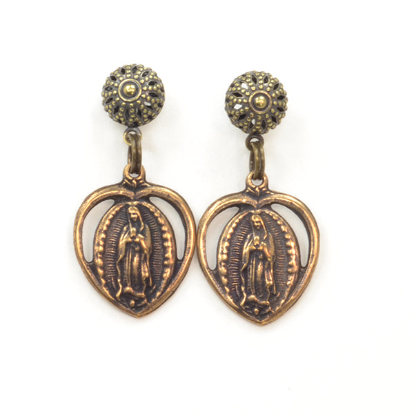 These earrings feature lovely heart-shaped medallions with the image of Our Lady of Guadalupe in cutout styling. The medallions dangle from ornate, dome shaped posts with filigree detailing and graceful lines. Made of antique gold plated brass, they perfectly compliment jewelry made of bronze and stand alone quite elegantly as faithful and meaningful accents. An extraordinary and distinctive gift for her.