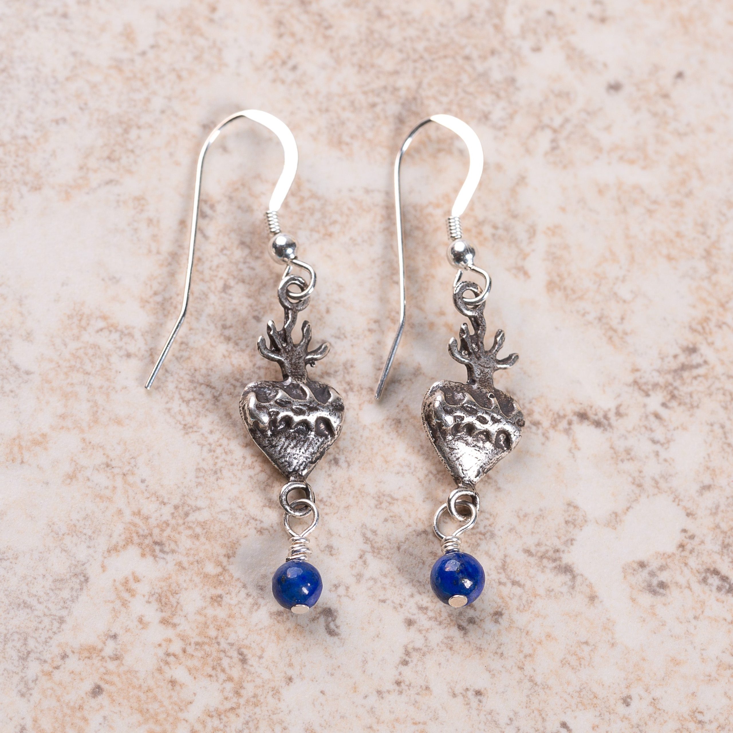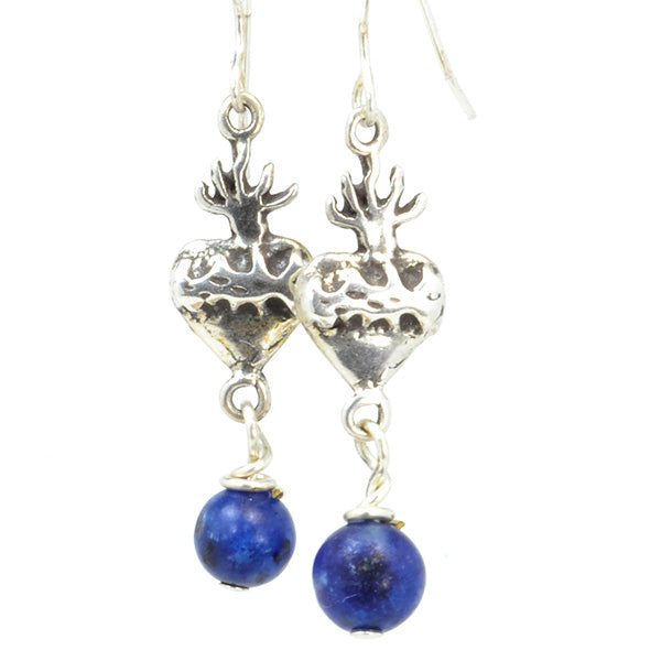Semi-precious lapis lazuli gemstone beads in a brilliant shade of blue dangle from sterling silver Sacred Heart charms in these lovely devotional earrings on french wires. Faithful, stylish and distinctive, they make a wonderful gift or a great addition to your own collection.