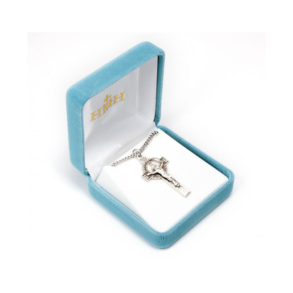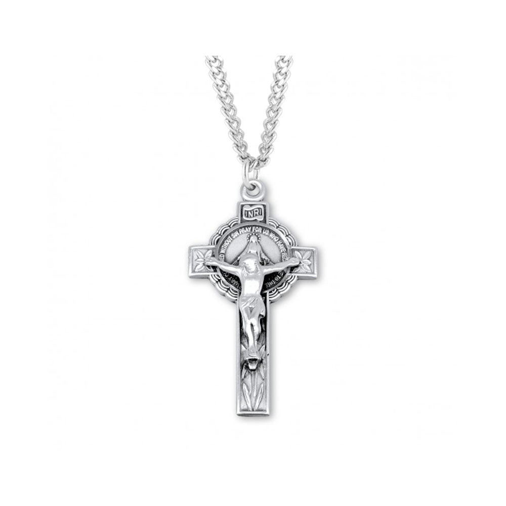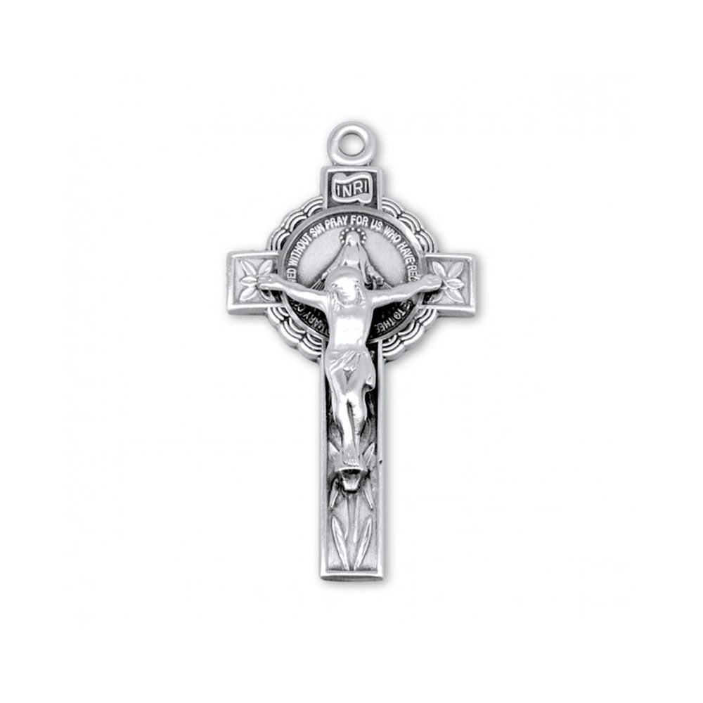The sterling silver crucifix hangs gracefully from a rhodium chain for ease of care and luster, and makes an extravagant gift. Made in the USA. Gift boxed for presentation.