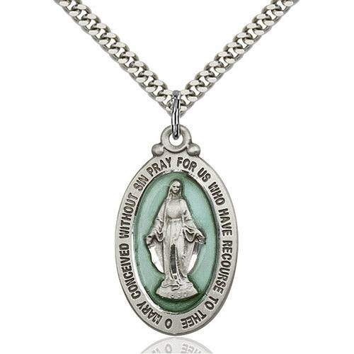 Sterling Silver Miraculous Pendant on a Light Rhodium Heavy Curb, 24″ Chain with clasp. Size: 1 1/8 x 5/8 inches