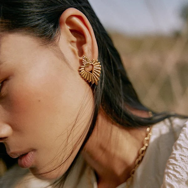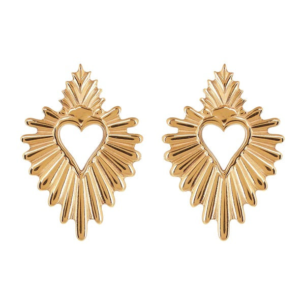 Sacred and traditional, yet still reflective of sleek, contemporary styling, these Sunburst Sacred Heart Earrings are a statement in faith, grace and beauty. Reminiscent of amulets from the 1800’s, they reflect both reverence and style. Gold plated with a matte finish, they are as striking as they are lovely. The generously sized earrings speak to feminine grace as much as they do to her faith. A distinctive addition to her jewelry collection, they will become a special favorite and reflect her faith. Packaged in a velvet gift box.