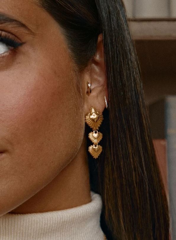 These versatile and stylish earrings feature the Three Hearts, in a 3-piece adjustable design. The gold plated earrings are beautifully shaped, and each piece contains small hooks at the back. Extend the length as you add each heart, or shorten the length by removing them.